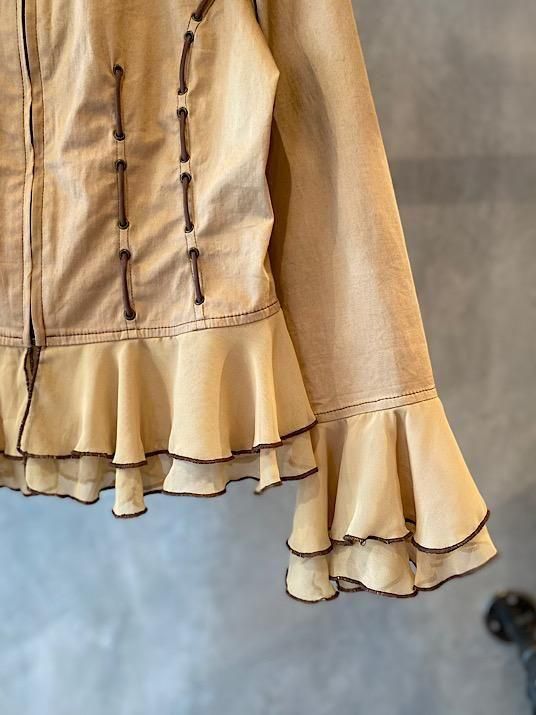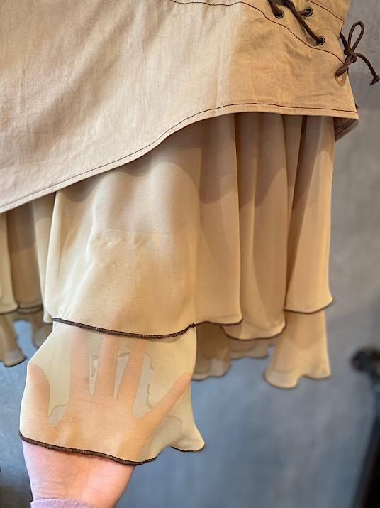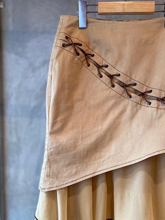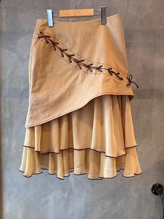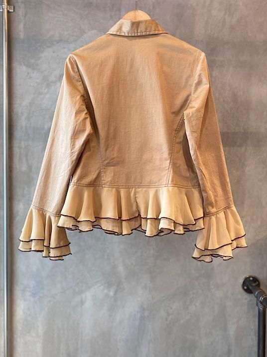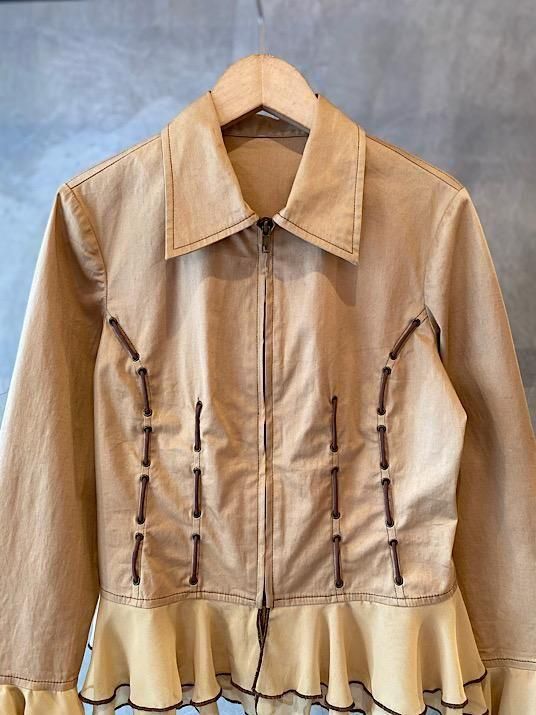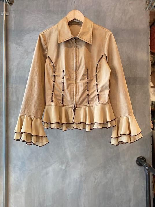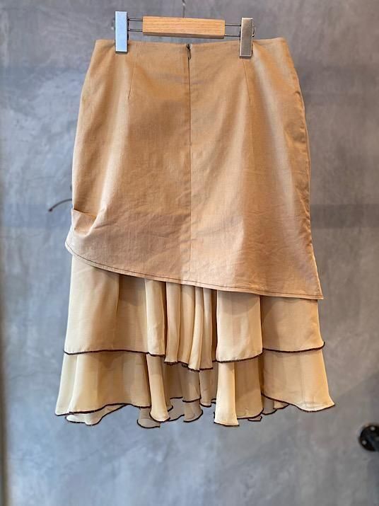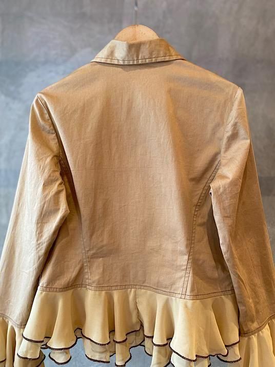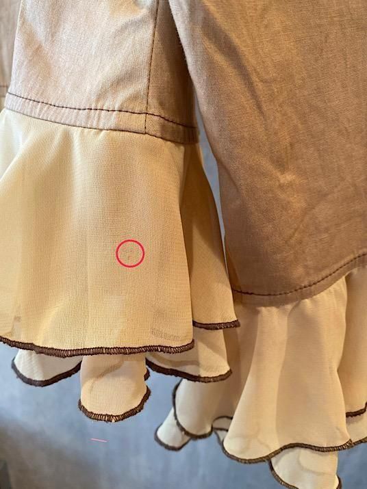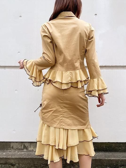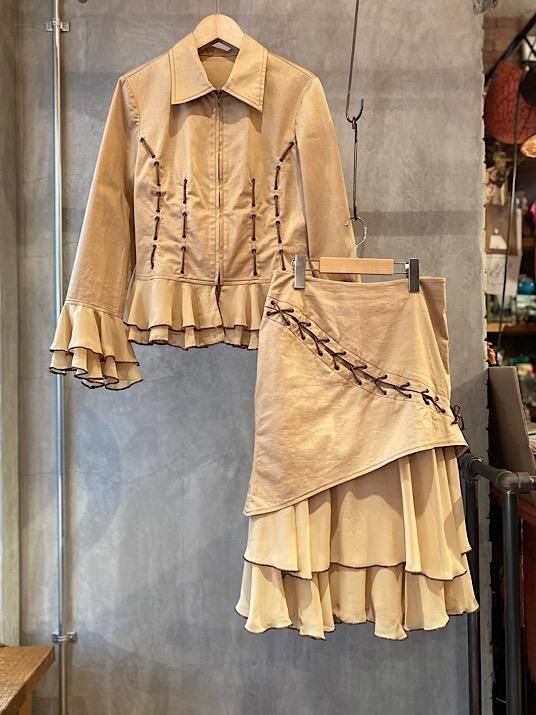 【MATERIAL】 COTTON POLYESTER (表記なし) 【 SIZE 】 -jacket- 表記なし(M相当) 肩幅 37cm / 身幅 44cm 袖丈 56cm / 着丈 55cm -skirt- 表記なし(M相当) ウエスト 66cm ヒップ 89cm 着丈 62cm ※ 採寸は念入りに行っておりますが、平置きによる採寸の為、数字に若干のずれが生じることもございます。何卒ご了承下さい。 ※ PC、モニター、ブラウザーの環境により実際の色やイメージと異なる場合がございます。予めご了承下さい。 【CONDITION】 後ろ身頃右裾付近に、薄っすらと小さな汚れがございます。 後ろ身頃左下裾付近に、小さなダメージがございます。 その他は特に目立ったダメージや汚れはございません。 良いヴィンテージコンディションと言えます。 ※usedのため多少の使用感はございますが、比較的状態の良い商品となります。商品画像参照 モデル身長 / 165cm ◆コンディションにつきまして◆ 商品は比較的状態の綺麗なものを厳選しておりますが、アイテムの年代や素材・生地感等によっては状態判断の受け取り方に個人差が生じてしまうため、一括りにダメージや汚れといっても規模の大小等明確な区別による言及ができない面がございます。 傷、汚れ等につきましては、一見してわかるようなものや着用に際し著しく目立つものは説明文や画像等でご紹介しておりますが、VINTAGE / USEDの範囲内と判断した細かなものにつきましては、説明を省いている場合がございます。予めご了承ください。 新品にはない特有の使用感や経年変化を含めた上で、VINTAGEの魅力をお楽しみ頂ければと思います。 ご不明点、ご心配な点はご注文前にお気軽にお問い合わせください。 ※代引き決済をご希望のお客様へ※ 3/16より全面的に不可とさせて頂いております。どうしても代引きでのご注文をご希望の場合は大変お手数ですが、当店営業時間内にお電話にてご連絡をお願い致します。 尚、発送日翌日より原則4日以内のお受け取りをお願いしております。 ご注文時にお客様が確実にお受け取り可能なお日にち、お時間をご指定の上、ご注文頂きますようお願い申し上げます。尚、発送日のご指定は承っておりませんのでご了承ください。 【発送につきまして】 当日16:00までのご注文→当日発送、翌日配達可能です。 16:00以降のご注文→翌日発送、翌々日配達可能です。 ※お客様の配達地域によっては最短で中1日での到着となります事もございます。 予めご理解のほど宜しくお願い致します。 【※クレジットカード決済時のエラーにつきまして】 「Instagram経由にて」リンクより商品を注文されます際に決済エラーとなってしまう事例がございます。(Instagram側の問題とのことです)その場合は大変お手数ですが、今一度Safariで開き直してから決済手続きを行なっていただきますようお願い申し上げます。